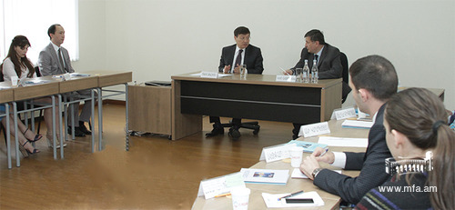 On 22th June, the Diplomatic School hosted the Ambassador of the Kazakhstan, Mr. Timur Urazayev. The Ambassador spoke about the foreign policy priorities of Kazakhstan, bilateral relations with Armenia, cooperation of two countries within different international organizations such as CSTO, EAEU as well as about Astana EXPO 2017. He answered students’ questions related to regional issues, bilateral relations, Kazakhstan and other topics.