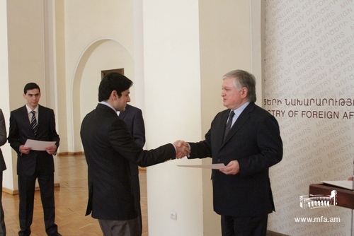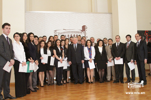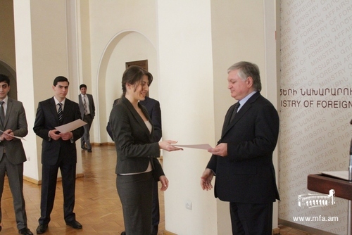 A formal ceremony of handing graduation certificates to the 2012 "Diplomacy and International Relations" program students of the Diplomatic School took place in the Ministry of Foreign Affiars. Minister of Foreign Affairs of the Republic of Armenia handed certificates to the 27 graduates of the program, congratulated and wished them well.