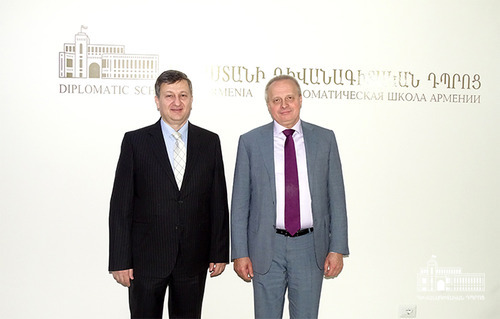 On February 28th Ambassador Vahe Gabrielyan, Director of the Diplomatic School of Armenia met with Sergey Kopirkin, Ambassador of the Russian Federation in the Republic of Armenia. Ambassador Kopirkin had a tour of the premises of the School, got acquainted with the exhibition dedicated to the 10th anniversary of the establishment of the Diplomatic School, its daily activities, as well as its academic programmes. Perspectives of cooperation among the Diplomatic School of the Ministry of Foreign Affairs of the Republic of Armenia, the Embassy of the Russian Federation in Armenia, the Russian Center of Science and Culture in Yerevan and the Diplomatic Academy of the Ministry of Foreign Affairs of the Russian Federation were discussed.