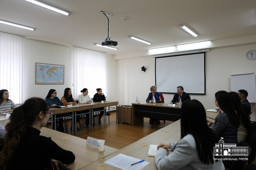 Այնուհետև պարոն Նոմը հանդիպեց Դիվանագիտական դպրոցի ունկնդիրների և ԱԳՆ դիվանագետների հետ, խոսեց Դիվանագիտության էստոնական դպրոցի գործունեության և Էստոնիայի արտաքին քաղաքականության առաջնահերթությունների մասին։